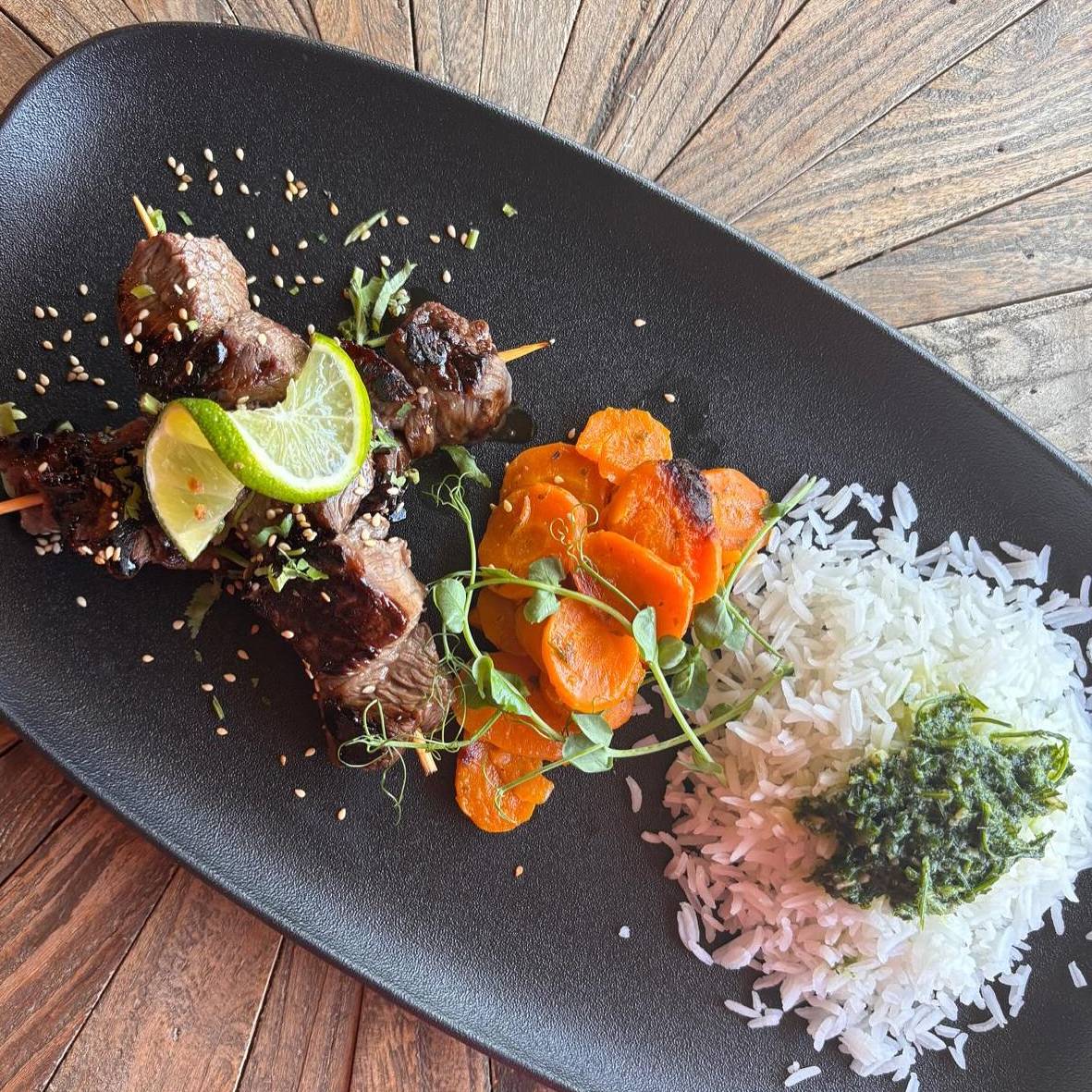 Brochettes de boeuf, légumes et frites maison